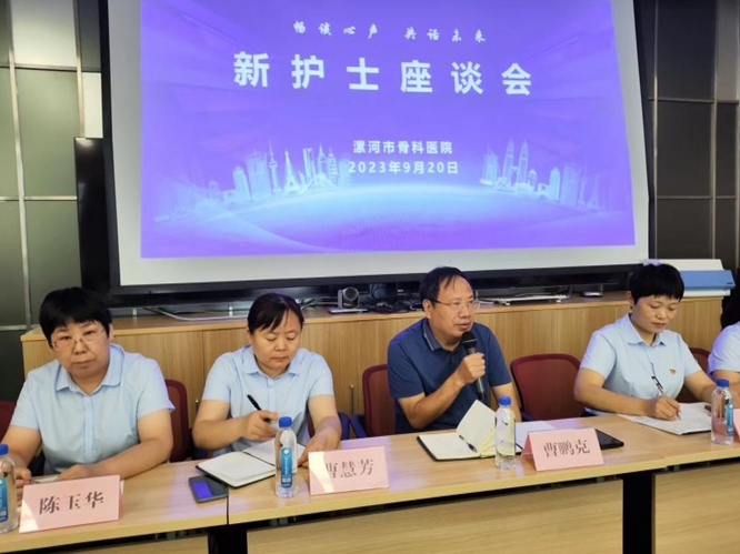 為加強醫(yī)院護(hù)理隊伍建設(shè),了解年輕護(hù)士思想動態(tài),引導(dǎo)新護(hù)士成長,凝聚新生力量,切實解決他們在工作中遇到的問題和困難,近日,漯河市骨科醫(yī)院(漯河醫(yī)專二附院)護(hù)理部舉辦新護(hù)士座談會。副院長曹鵬克、護(hù)理部副主任趙春紅、曹慧芳、王爽及科室護(hù)士長代表出席會議,會議由護(hù)理部副主任王爽主持。