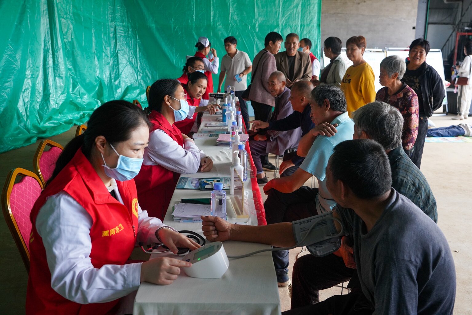 義診現(xiàn)場,王瑾院長帶領(lǐng)心血管內(nèi)科、中醫(yī)針灸科、眼科、皮膚科、超聲科、神經(jīng)內(nèi)科、急診科等多個科室專家,為群眾進(jìn)行測量血壓、血糖、心電圖檢查,健康咨詢等服務(wù),并發(fā)放健康宣傳手冊。急診科醫(yī)護(hù)人員為現(xiàn)場群眾演示心肺復(fù)蘇急救知識,手把手指導(dǎo)大家練習(xí)。
