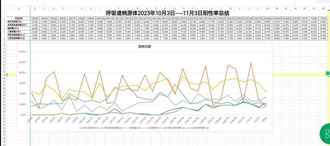 為應(yīng)對兒童就診高峰,市二院全面落實(shí)市衛(wèi)健委要求,在迅速增設(shè)病區(qū)、增開白天及夜間兒科專家門診同時(shí),醫(yī)院檢驗(yàn)科、兒科、急診等相關(guān)科室統(tǒng)計(jì)了10月以來呼吸道病毒檢驗(yàn)數(shù)據(jù)及結(jié)果,分析發(fā)現(xiàn)10月17日后平均每日送檢量約是之前的兩倍,提示呼吸道感染患者較前翻倍趨勢。支原體感染陽性率逐日攀升,至10月22日達(dá)到頂峰,陽性率最高達(dá)57.7%,之后呈逐漸下降趨勢。大約同時(shí)期,甲型流感/乙型流感陽性率開始上升,并于10月31日達(dá)到陽性率頂峰,分別為24.7%和23.4%。往年乙型流感陽性率極低,今年陽性率與甲流持平,提醒我們需要同時(shí)對流感保持警惕。呼吸道合胞病毒與人鼻病毒陽性率一直普遍較高,如呼吸道合胞病毒陽性率最高達(dá)98.3%。