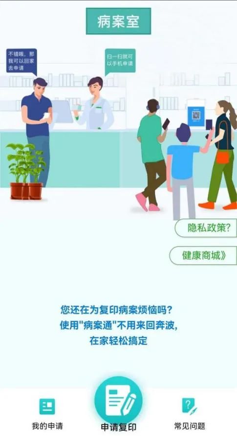 患者在院期間,如需辦理復(fù)印病歷,可掃碼關(guān)注“病案通”,選擇漯河醫(yī)專二附院,點(diǎn)擊“申請(qǐng)復(fù)印”并填寫相關(guān)信息,待病歷歸檔后將按照記載信息給予郵寄。