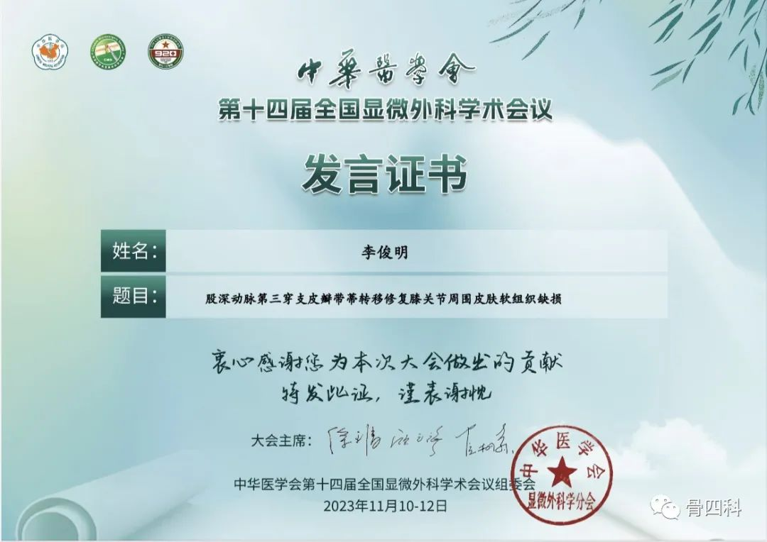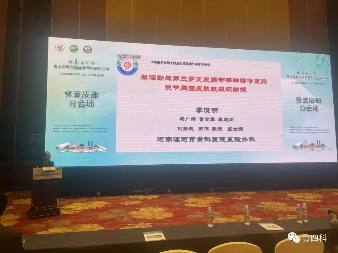 在穿支皮瓣分會場,李俊明就《股深動脈第三穿支皮瓣帶蒂轉(zhuǎn)移修復(fù)膝關(guān)節(jié)周圍皮膚軟組織缺損》作主題演講,并和同仁們展開討論。
