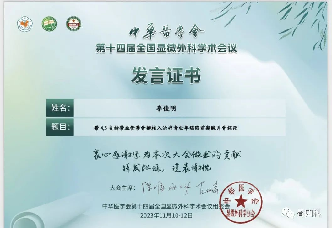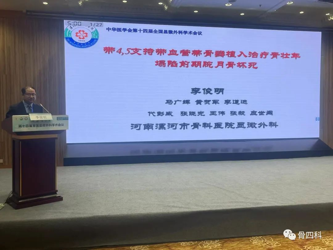 在骨顯微修復(fù)分會場,李俊明就《帶四、五支持帶血管蒂骨瓣植入治療青壯年塌陷前期腕月骨壞死》展開精彩發(fā)言。