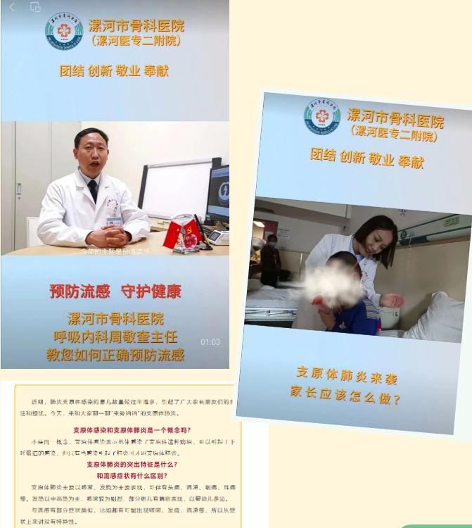 入秋以來呼吸道疾病高發(fā),醫(yī)院結(jié)合日常工作經(jīng)驗(yàn),不斷加強(qiáng)公眾教育和健康宣傳。邀請(qǐng)兒科、呼吸內(nèi)科等科室的多位專家錄制科普視頻,并利用視頻號(hào)、抖音號(hào)等多平臺(tái)向公眾發(fā)布健康宣教知識(shí)。同時(shí),向各科室征集健康科普文章,通過漯河市骨科醫(yī)院微信公眾平臺(tái)及省市級(jí)媒體進(jìn)行發(fā)布,多渠道向公眾普及兒童常見疾病的預(yù)防和治療知識(shí),為支原體肺炎的預(yù)防和應(yīng)急處理提供支持,提高家長們的健康意識(shí)和應(yīng)對(duì)能力。