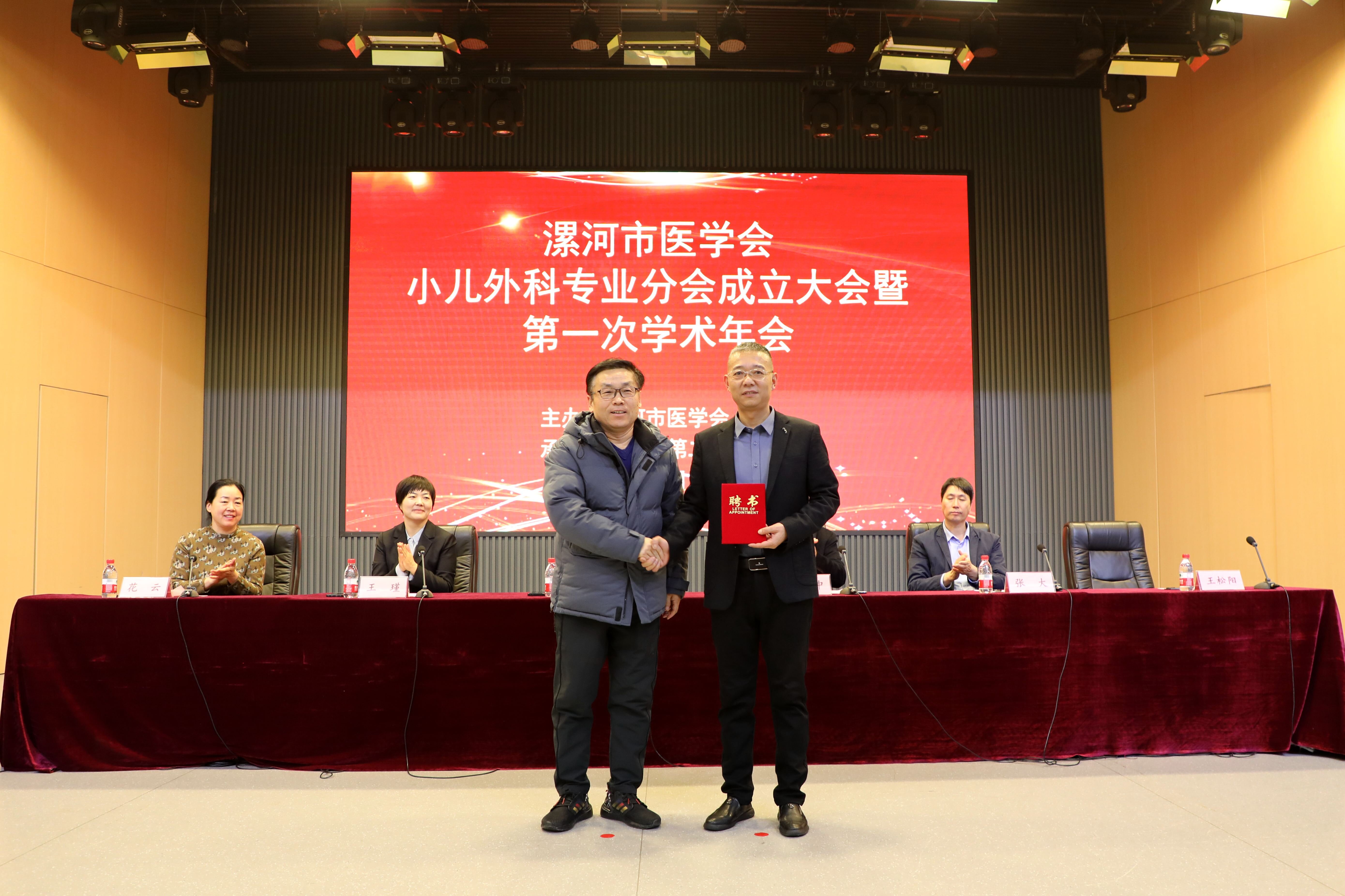 儀式現(xiàn)場(chǎng),市衛(wèi)健委二級(jí)調(diào)研員趙明陽(yáng)為漯河市首屆小兒外科專業(yè)分會(huì)主任委員王松陽(yáng)頒發(fā)聘書。希望小兒外科專業(yè)分會(huì)充分發(fā)揮學(xué)會(huì)橋梁紐帶作用,溝通協(xié)調(diào)好各醫(yī)院委員,拓寬思維,大膽創(chuàng)新,積極吸納相關(guān)學(xué)科的現(xiàn)代科學(xué)方法和技術(shù)手段,共同推動(dòng)漯河市小兒外科事業(yè)的整體發(fā)展。