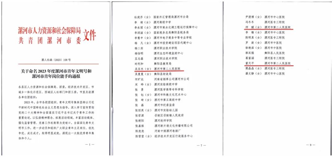 近日,市人社局和共青團(tuán)漯河市委印發(fā)了《關(guān)于命名2023年度漯河市青年文明號(hào)和漯河市青年崗位能手的通報(bào)》文件,共計(jì)表彰了全市各行業(yè)青年崗位能手77名,其中市二院急診科吳亞杰、董天平、師媛3人“同時(shí)”光榮上榜,榮獲2023年度“漯河市青年崗位能手”榮譽(yù)稱號(hào)!