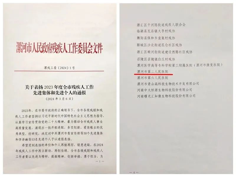 3月6日,漯河市人民政府殘疾人工作委員會(huì)發(fā)布《關(guān)于表?yè)P(yáng)2023年度全市殘疾人工作先進(jìn)集體和先進(jìn)個(gè)人的通報(bào)》,市二院榮獲“2023年度全市殘疾人工作先進(jìn)集體”榮譽(yù)稱(chēng)號(hào)。