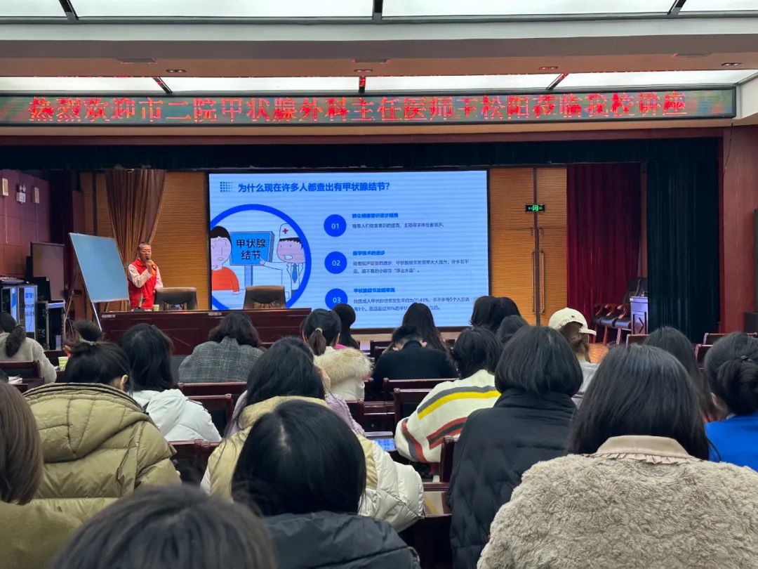 義診結(jié)束后,市二院小兒外科主任王松陽對老師們進(jìn)行了《甲狀腺結(jié)節(jié)的誘因及防治》知識講座,詳細(xì)講解了甲狀腺疾病的常見類型、甲狀腺結(jié)節(jié)的誘因、預(yù)防方法和術(shù)前術(shù)后注意事項(xiàng)等知識。
