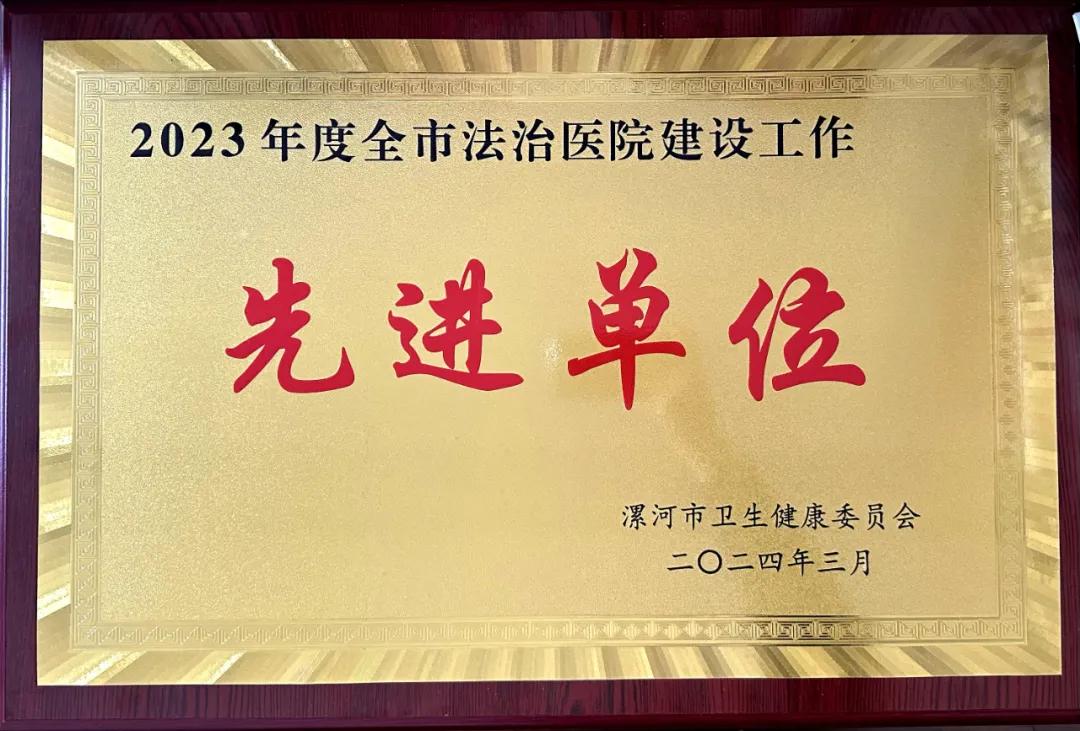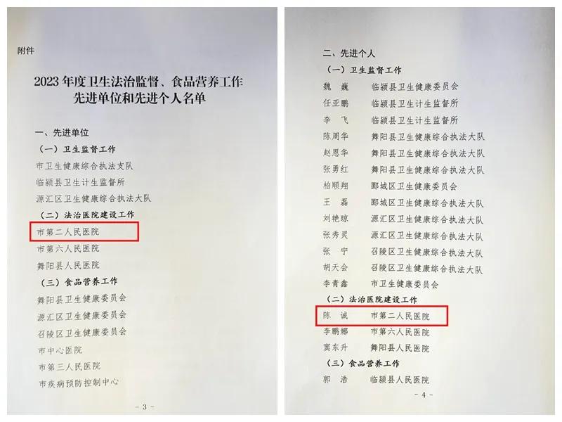 在3月20日召開的2024年度全市疾病預(yù)防控制、衛(wèi)生法治監(jiān)督暨食品營養(yǎng)工作會議上,市二院榮獲2023年度全市法治醫(yī)院建設(shè)工作先進單位,陳誠榮獲全市法治醫(yī)院建設(shè)工作先進個人。