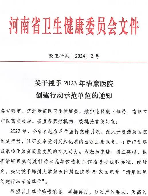 清風(fēng)吹拂沙澧,廉潔促進(jìn)發(fā)展。近日,在河南省衛(wèi)健委公布的《關(guān)于授予2023年清廉醫(yī)院創(chuàng)建行動(dòng)示范單位的通知》中,漯河醫(yī)專(zhuān)二附院以優(yōu)質(zhì)的醫(yī)療服務(wù)、完善的制度建設(shè)、扎實(shí)的清廉文化夯基固本、提質(zhì)增效,被授予2023年全省清廉醫(yī)院創(chuàng)建行動(dòng)示范單位,充分展現(xiàn)了漯河市清廉醫(yī)院創(chuàng)建的亮點(diǎn)特色,讓清廉醫(yī)院成為清廉漯河建設(shè)顯著標(biāo)識(shí)。