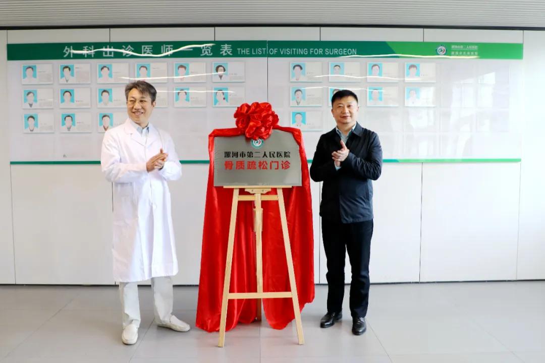 儀式現場,黨委書記魏松與黃宗強教授共同為“漯河市第二人民醫(yī)院骨質疏松門診”揭牌。