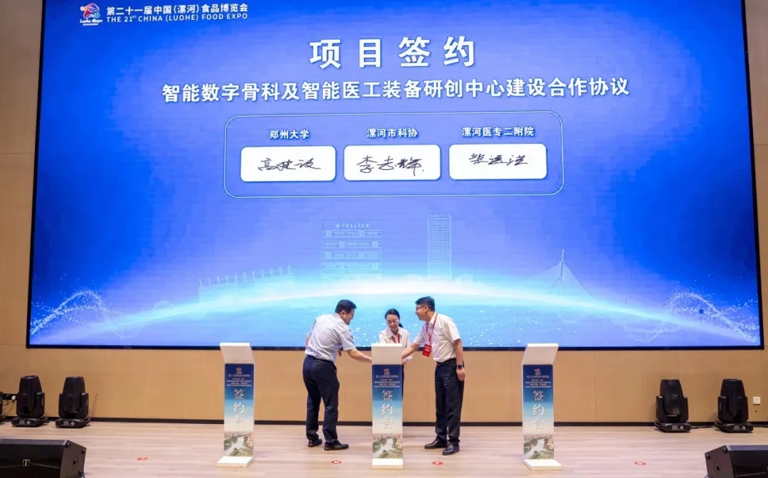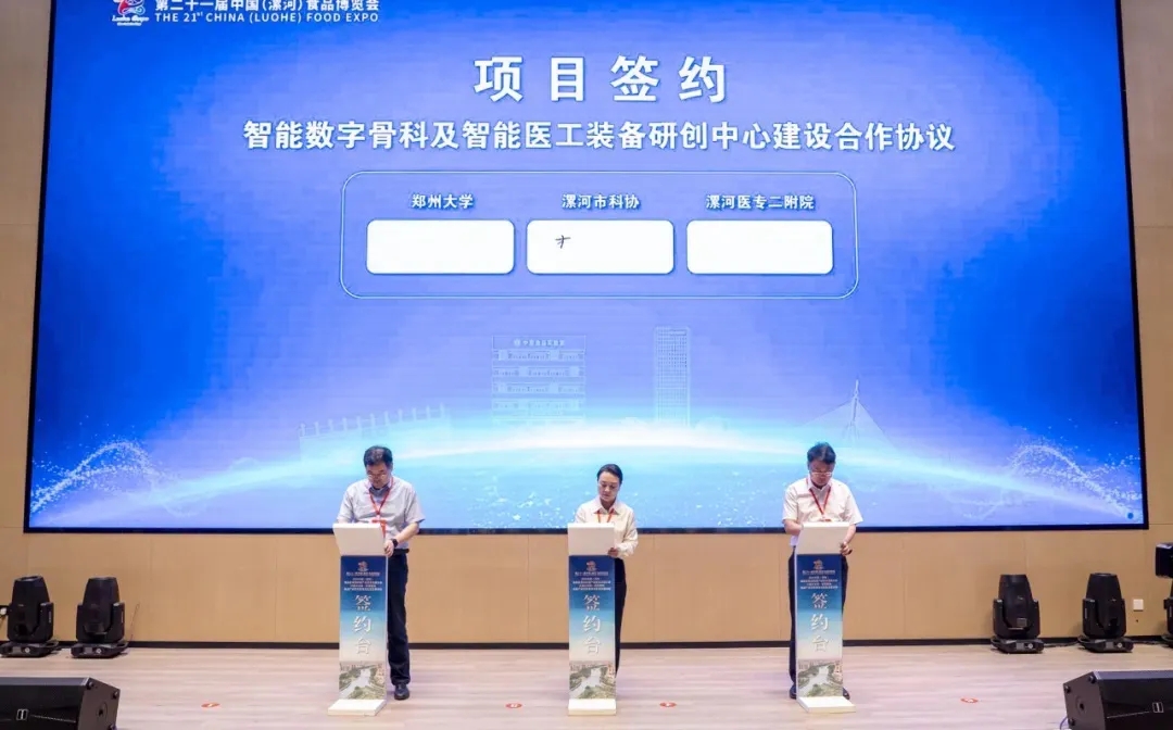開幕式現(xiàn)場,漯河市骨科醫(yī)院(漯河醫(yī)專二附院、漯河市立醫(yī)院)黨委書記柴運(yùn)洪與鄭州大學(xué)機(jī)械與動(dòng)力工程學(xué)院院長、教授高建設(shè),漯河市科協(xié)黨組書記、主席李志輝簽訂了智能數(shù)字骨科及智能醫(yī)工裝備研創(chuàng)中心建設(shè)合作協(xié)議。