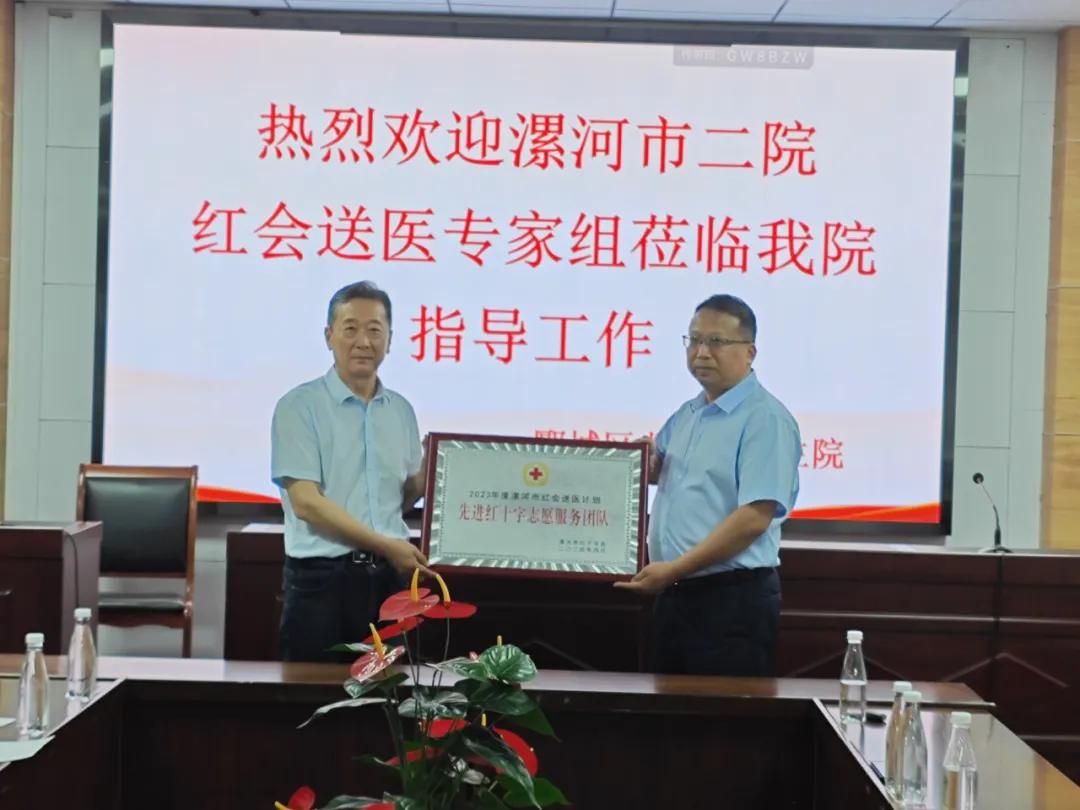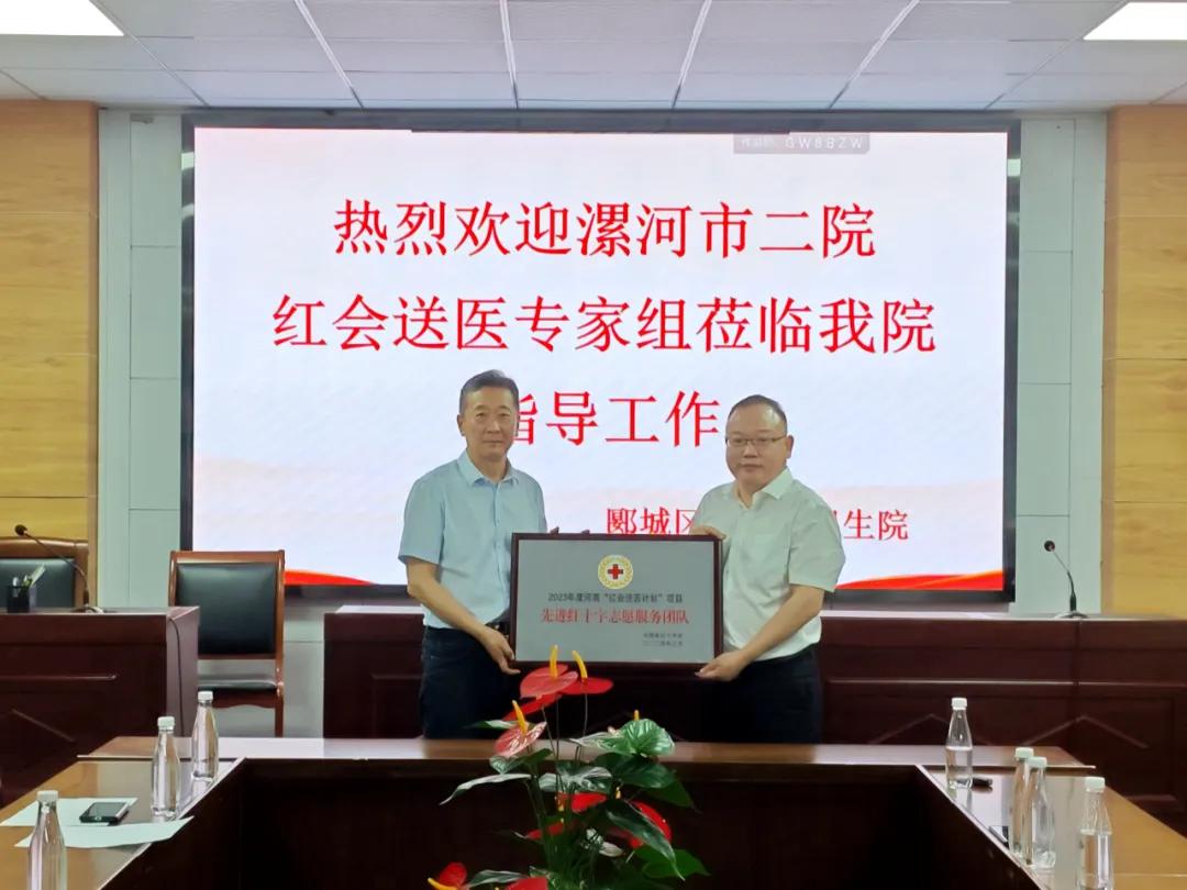 漯河市紅十字會黨組成員、副會長劉國防,市二院副院長張曉東,市二院工會主席李世學(xué),郾城區(qū)紅十字會副會長李山峰,龍城鎮(zhèn)衛(wèi)生院相關(guān)負責(zé)同志出席了本次對接會議和義診活動。對接會上,市紅會副會長劉國防對市二院“紅會送醫(yī)計劃”所做的工作表示了高度的肯定,并向醫(yī)院頒發(fā)了2023年河南省“紅會送醫(yī)計劃”先進單位、2023年漯河市“紅會送醫(yī)計劃”先進單位兩塊獎牌,對市二院李慧新等7名同志獲得省級和市級“優(yōu)秀紅十字醫(yī)療專家志愿者”稱號表示祝賀。