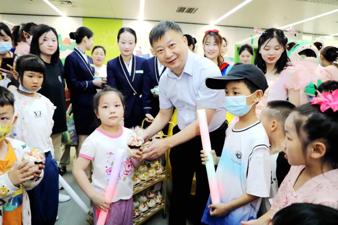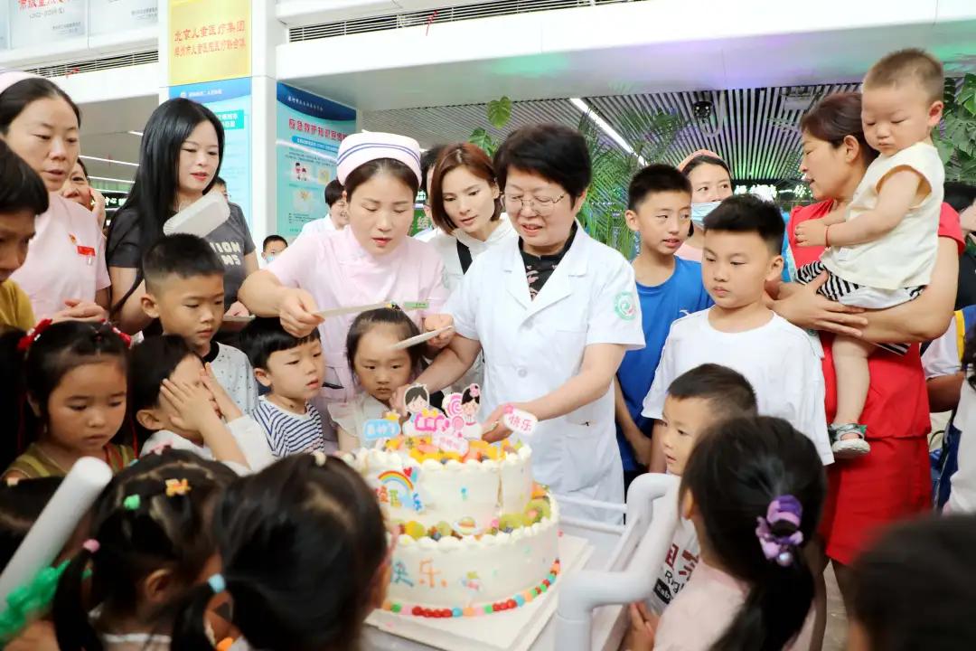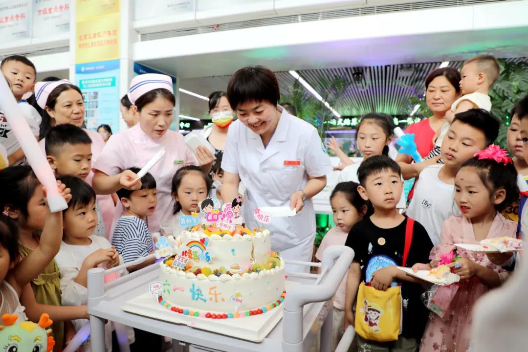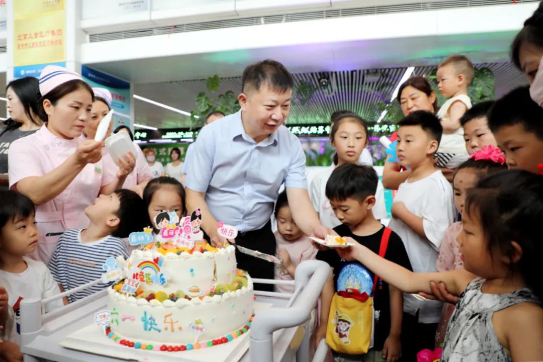 在門診大廳,黨委書記魏松、院長(zhǎng)王瑾與兒科專家、護(hù)士長(zhǎng)、孩子們一起切下節(jié)日蛋糕,并代表全院醫(yī)護(hù)人員對(duì)孩子們表示衷心的祝福,希望孩子們健康快樂成長(zhǎng)。現(xiàn)場(chǎng),醫(yī)護(hù)人員化身白雪公主、花仙子、小黃人、網(wǎng)紅青蛙與小朋友們熱情互動(dòng),友好交流,派發(fā)精心準(zhǔn)備的節(jié)日禮物。