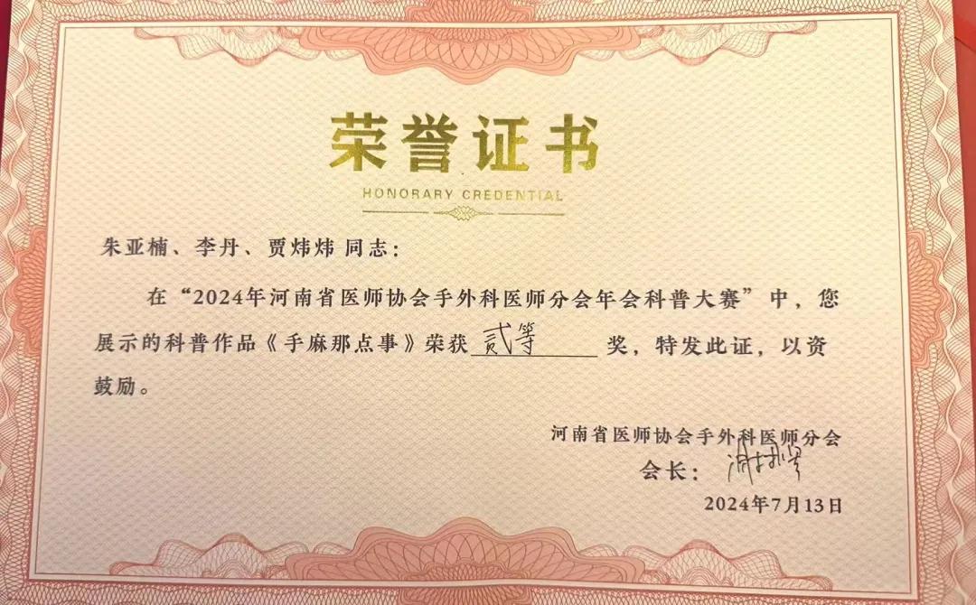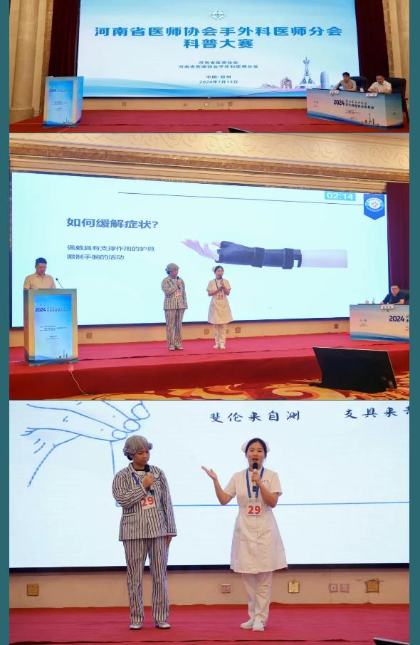 下午,在“2024年河南省醫(yī)師協(xié)會手外科醫(yī)師分會年會科普大賽”上,來自全省各地的精英選手們以生動多樣的形式,將復雜的醫(yī)學知識轉化為易于理解、貼近生活的科普內容,展現(xiàn)了手外科醫(yī)學的魅力與溫度。經過激烈角逐,漯河市骨科醫(yī)院(漯河醫(yī)專二附院、漯河市立醫(yī)院)副主任醫(yī)師代彭威、護師李丹、護士賈煒煒榮獲二等獎。他們在工作之余,以《腕管綜合征》為題積極準備,認真撰寫演講材料、精心制作演講幻燈片、反復推敲演練,對腕管的高發(fā)人群以及怎么預防怎么鍛煉,進行了生動形象的專題講解。在高手云集的大賽中榮獲優(yōu)異成績,充分展示了漯河市骨科醫(yī)院手外科團隊在學術研究與科普傳播方面的雙重實力。