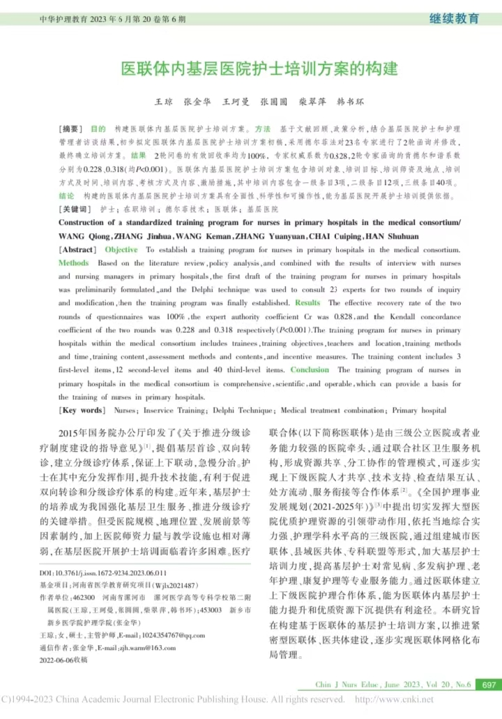 漯河醫(yī)專二附院(漯河市骨科醫(yī)院、漯河市立醫(yī)院)作為國家三級綜合醫(yī)院,高度重視醫(yī)聯(lián)體建設(shè),自2019年成立醫(yī)聯(lián)體組織以來,作為牽頭單位已簽署了30余家成員單位,近年來不斷探索基層醫(yī)院護(hù)士來院培訓(xùn)學(xué)習(xí)方案,2021年我院申報獲批河南省醫(yī)學(xué)教育研究項目1項,項目名稱為“區(qū)域醫(yī)療聯(lián)合體內(nèi)基層醫(yī)院護(hù)士規(guī)范化培訓(xùn)管理模式的構(gòu)建”,項目團(tuán)隊成員經(jīng)過文獻(xiàn)檢索、調(diào)查研究、專家函詢等形式構(gòu)建了“基于醫(yī)聯(lián)體的基層醫(yī)院護(hù)士培訓(xùn)方案”,該培訓(xùn)方案具有可信性、可行性和可操作性,內(nèi)容全面,有助于提高基層護(hù)士專業(yè)服務(wù)能力的提升,被中文核心期刊中華護(hù)理教育雜志錄用并發(fā)表。
