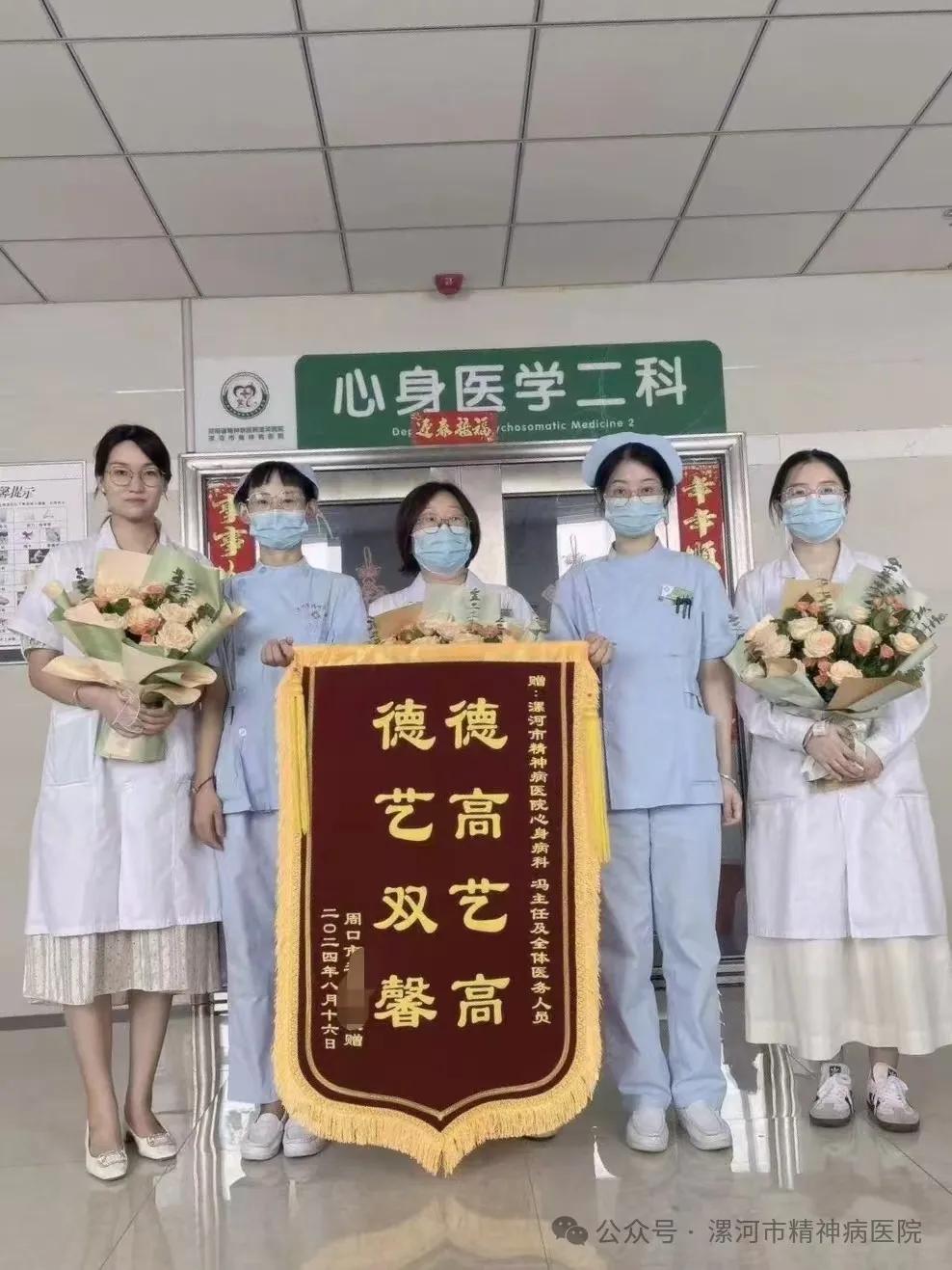 在醫(yī)師節(jié)當(dāng)天,漯河市精神病醫(yī)院心身醫(yī)學(xué)二科收到了來自周口市患者—面繡著“德高藝高,德藝雙馨”的錦旗,為醫(yī)師節(jié)增添了一抹璀璨的光彩。