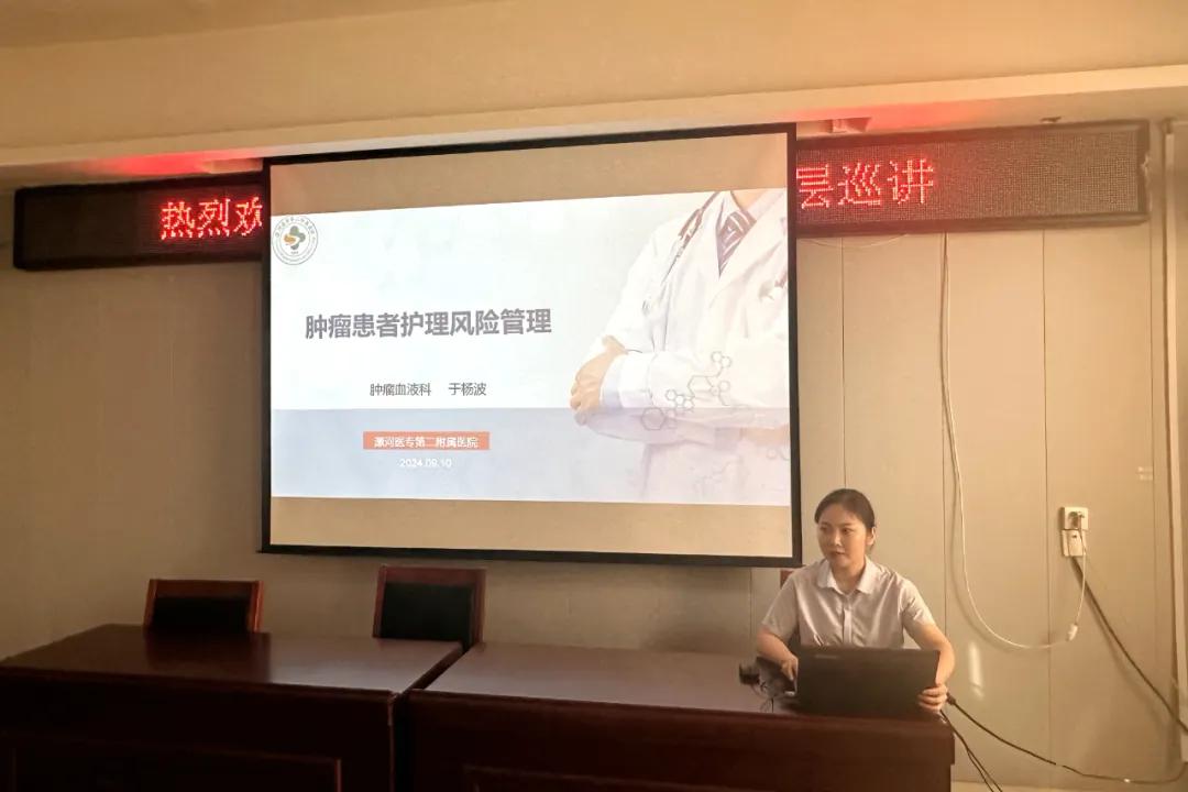 此次巡講中,于楊波護(hù)士長、張姣主管護(hù)師、王惠娟主管護(hù)師分別就《腫瘤患者護(hù)理風(fēng)險管理》《靜脈治療血管通路管理規(guī)范》《腫瘤患者癌痛規(guī)范化管理》為主題進(jìn)行了精彩分享。其中于楊波護(hù)士長主要是從腫瘤患者常見的護(hù)理風(fēng)險問題如何識別、評估、規(guī)范管理以及護(hù)理風(fēng)險管理的一些措施、經(jīng)驗、理念進(jìn)行了分享。