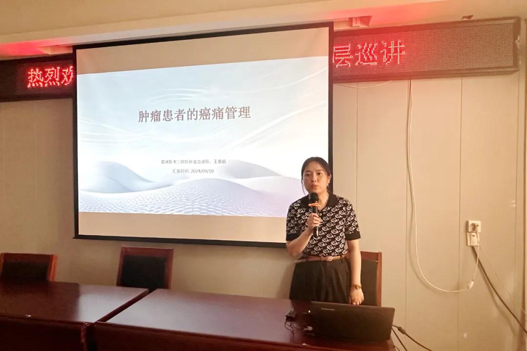 王惠娟主管護(hù)師以《腫瘤患者癌痛規(guī)范化管理》為主題,分享了腫瘤患者癌痛的規(guī)范化管理、評估,藥物的三階梯,常見的止疼藥應(yīng)用過程中的誤區(qū)以及中醫(yī)護(hù)理適宜技術(shù)在癌痛中的應(yīng)用等內(nèi)容。