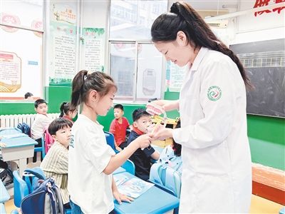 課間,口腔健康科普教育展板吸引學(xué)生們的目光??谇会t(yī)師認真向?qū)W生們講解了口腔健康的重要性,教育他們從小養(yǎng)成保護牙齒的好習(xí)慣。