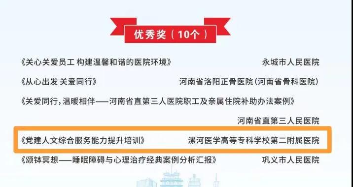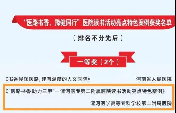 大會通報了系列活動優(yōu)秀入圍作品名單,其中,漯河市骨科醫(yī)院(漯河醫(yī)專二附院、漯河市立醫(yī)院)報送的作品《醫(yī)路書香助力三甲》榮獲“醫(yī)路書香、豫健同行”醫(yī)院讀書活動亮點特色案例一等獎;《大醫(yī)吳廣良》榮獲“身邊的榜樣”敘事醫(yī)學(xué)故事一等獎;《黨建引領(lǐng)人文綜合服務(wù)能力提升》榮獲“員工關(guān)愛計劃”優(yōu)秀案例!