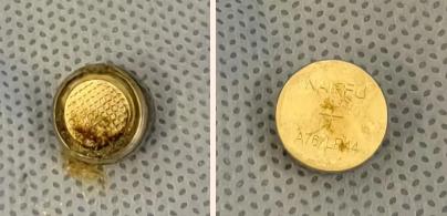 上圖為進(jìn)入鼻腔20分鐘的紐扣電池,已經(jīng)滲出強(qiáng)腐蝕性堿性液體,長時(shí)間會(huì)引起局部組織缺失和軟骨破壞,導(dǎo)致組織粘連或瘢痕形成,嚴(yán)重時(shí)引起鼻中隔穿孔等并發(fā)癥。