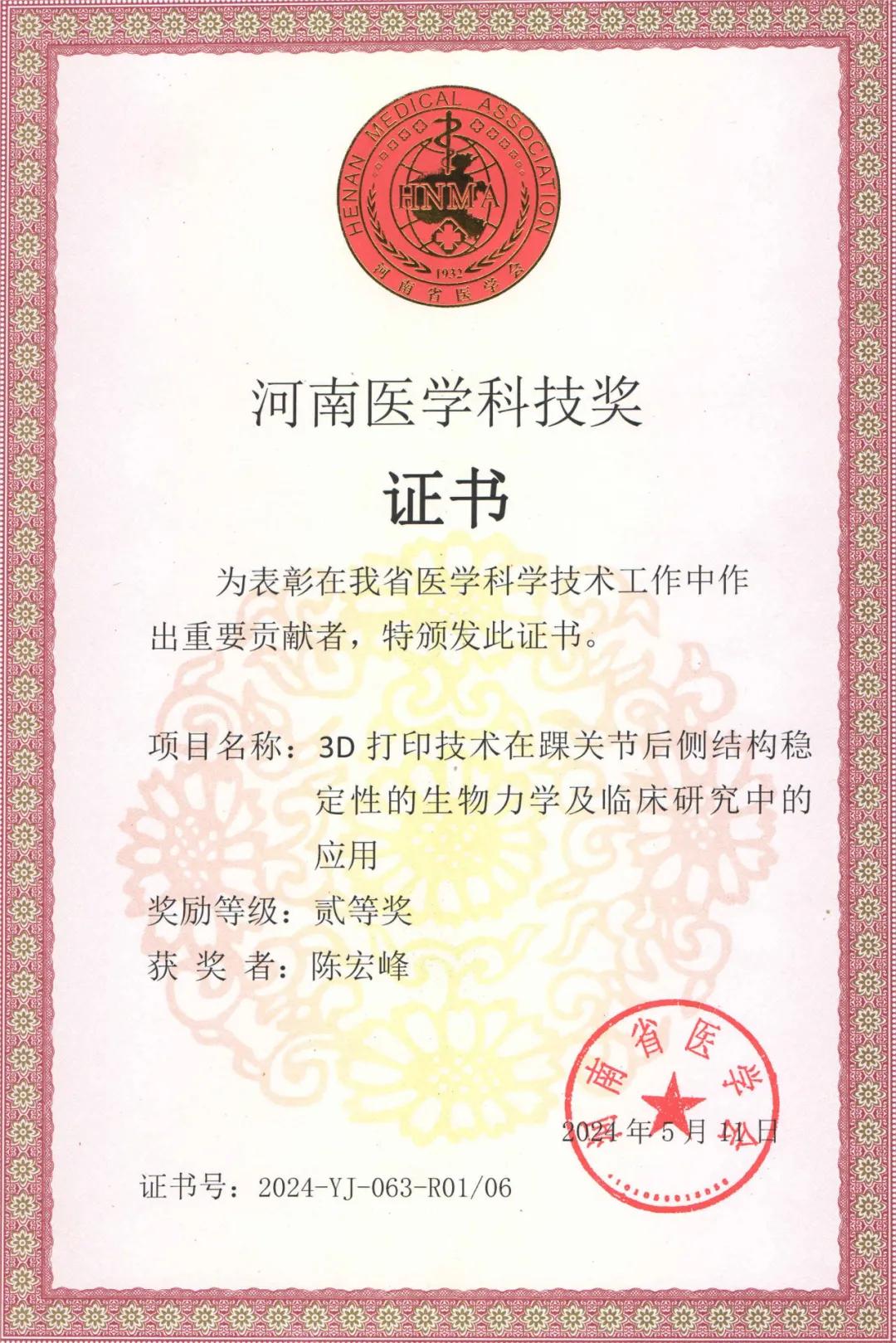 在陳宏峰主任帶領(lǐng)下,2012年起,在豫中南地區(qū)率先開展踇外翻、平足癥、高弓足畸形的規(guī)范化矯治。2012年完成豫中南第一例自體韌帶重建治療踝關(guān)節(jié)外側(cè)韌帶陳舊性損傷,2019年完成豫中南第一例踝上截骨術(shù)(SMO)治療踝關(guān)節(jié)骨性關(guān)節(jié)炎,2020年完成豫中南第一例軟骨移植術(shù)(AOT)治療距骨軟骨損傷。2021年完成豫中南第一例人工全踝關(guān)節(jié)置換術(shù)治療終末期踝關(guān)節(jié)骨性關(guān)節(jié)炎,2024年開展人工跖趾關(guān)節(jié)置換治療踇外翻、類風濕關(guān)節(jié)炎足,相繼開展了脛骨橫向骨搬運術(shù)治療糖尿病足,應(yīng)用骨科手術(shù)機器人結(jié)合髓內(nèi)釘微創(chuàng)治療踝關(guān)節(jié)骨折、跟骨骨折,踝關(guān)節(jié)鏡下微創(chuàng)修復(fù)踝關(guān)節(jié)外側(cè)韌帶損傷等領(lǐng)先技術(shù),在豫中南地區(qū)享有盛譽。