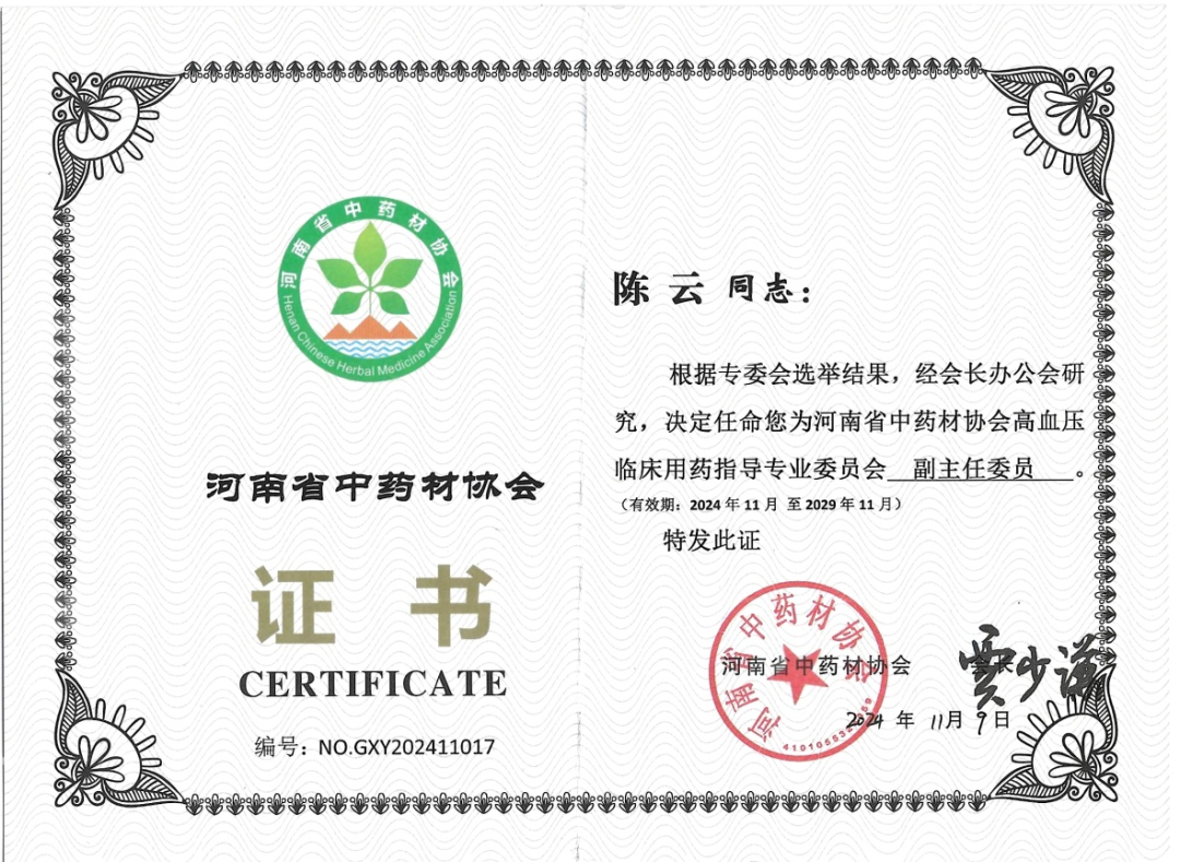 11月8日-11月9日,由河南省中西醫(yī)結(jié)合醫(yī)院、河南省高血壓中西醫(yī)結(jié)合診療中心承辦的國(guó)家繼續(xù)教育項(xiàng)目“難治性高血壓中西醫(yī)結(jié)合綜合防治培訓(xùn)班”、河南省繼續(xù)教育項(xiàng)目“中西醫(yī)結(jié)合治療難治性高血壓適宜技術(shù)培訓(xùn)班”暨河南省中藥材協(xié)會(huì)高血壓臨床用藥指導(dǎo)專業(yè)委員會(huì)成立大會(huì)在河南鄭州順利召開。會(huì)上,漯河市中醫(yī)院心病科副主任陳云被評(píng)選為河南省中藥材協(xié)會(huì)高血壓臨床用藥指導(dǎo)專業(yè)委員會(huì)副主任委員。