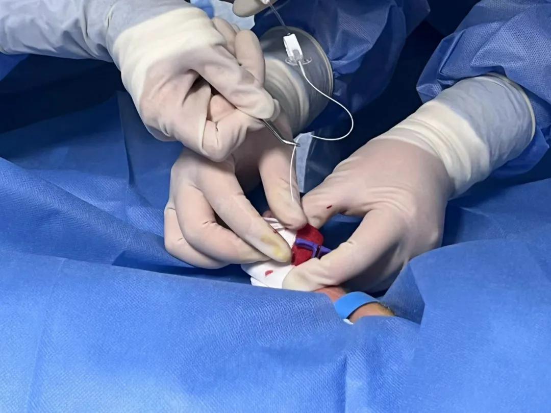 下午 16點,在護理部副主任曹慧芳的指導(dǎo)下,兒科李紅護士長與趙曙光精心進行置管前準(zhǔn)備,血液凈化室呂春曉護士長和腫瘤血液科于楊波護士長全力協(xié)助,每一個細節(jié)都彰顯著團隊的默契與協(xié)作。醫(yī)護人員全神貫注地為小天使進行 PICC 置管穿刺。他們的每一個動作都精準(zhǔn)而溫柔,仿佛在雕琢一件稀世珍寶,因為我們深知,這是守護新生命的關(guān)鍵一步。