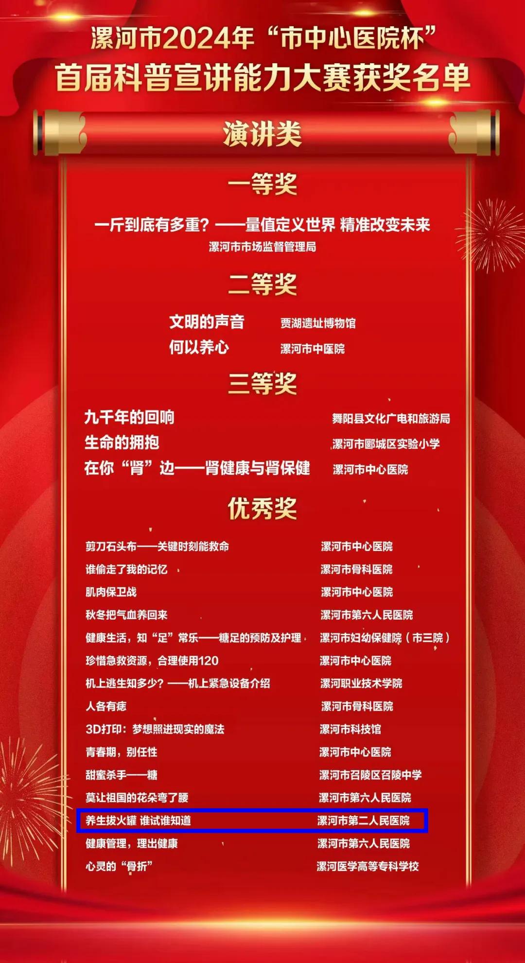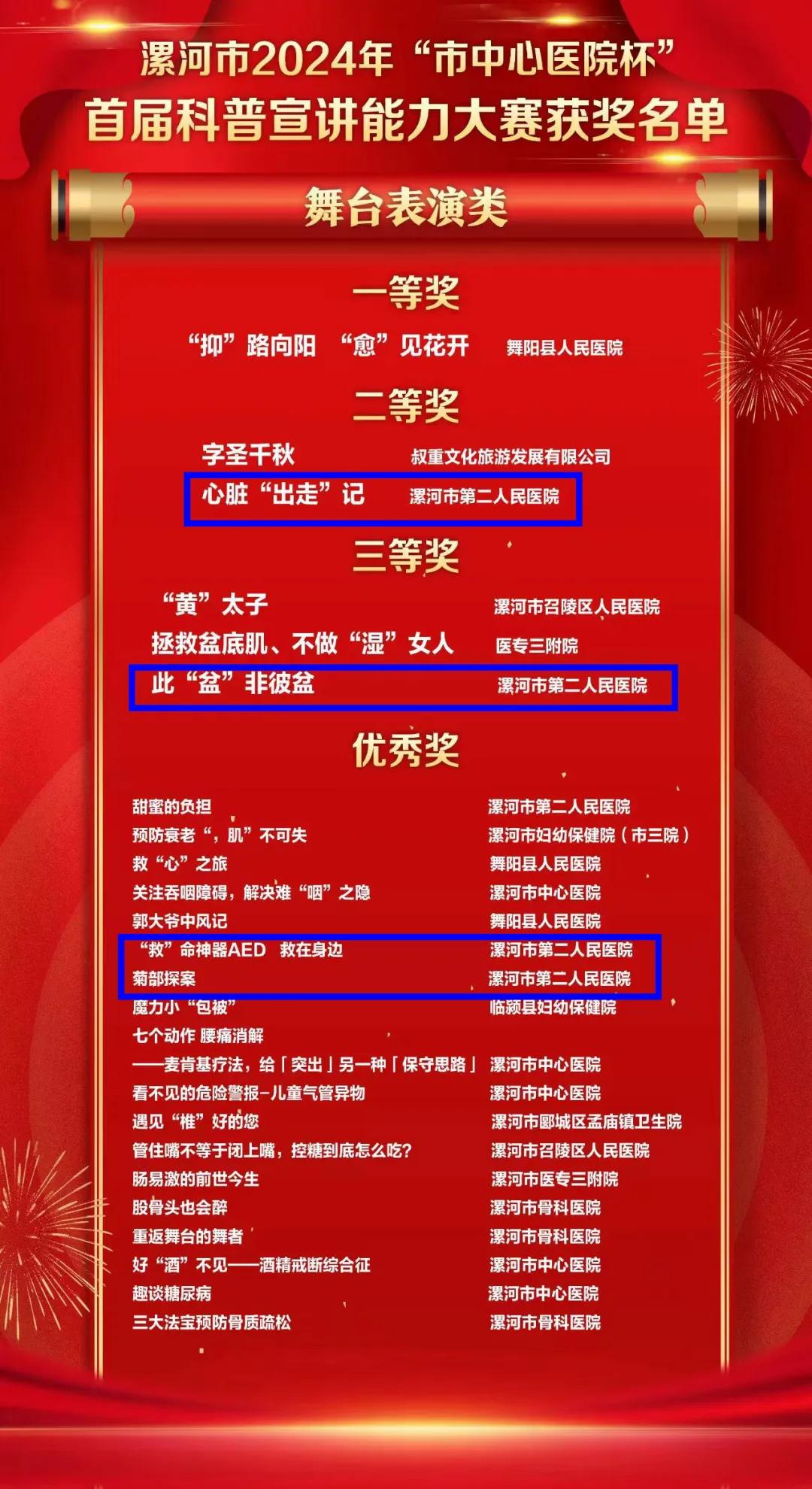 12月18日,由中共漯河市委宣傳部、中共漯河市委人才工作領導小組辦公室、漯河市科學技術協(xié)會、漯河市衛(wèi)生健康委員會聯合主辦,漯河市中心醫(yī)院冠名,漯河日報社承辦的漯河市2024年“市中心醫(yī)院杯”首屆科普宣講能力大賽決賽落下帷幕。經過激烈角逐,市二院精心選送的參賽作品由劉橋、李媛、安自譚、袁泉、任崢崢出演的《心臟“出走”記》榮獲舞臺表演類二等獎;由井紅鴿、李靜麗、鄭家珍、丁歡歡、程亞麗出演的《此“盆”非彼“盆”》榮獲舞臺表演類三等獎;另有四個參賽作品榮獲優(yōu)秀獎。