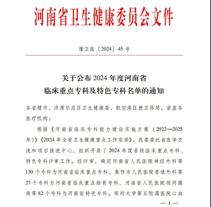 12月24日,河南省衛(wèi)生健康委下發(fā)《關(guān)于公布2024年度河南省臨床重點(diǎn)??萍疤厣珜?泼麊蔚耐ㄖ罚ㄔバl(wèi)醫(yī)〔2024〕45號)。漯河醫(yī)專高等??茖W(xué)校第二附屬醫(yī)院運(yùn)動(dòng)醫(yī)學(xué)科、護(hù)理專科成功通過評審,被確定為河南省臨床重點(diǎn)培育專科。