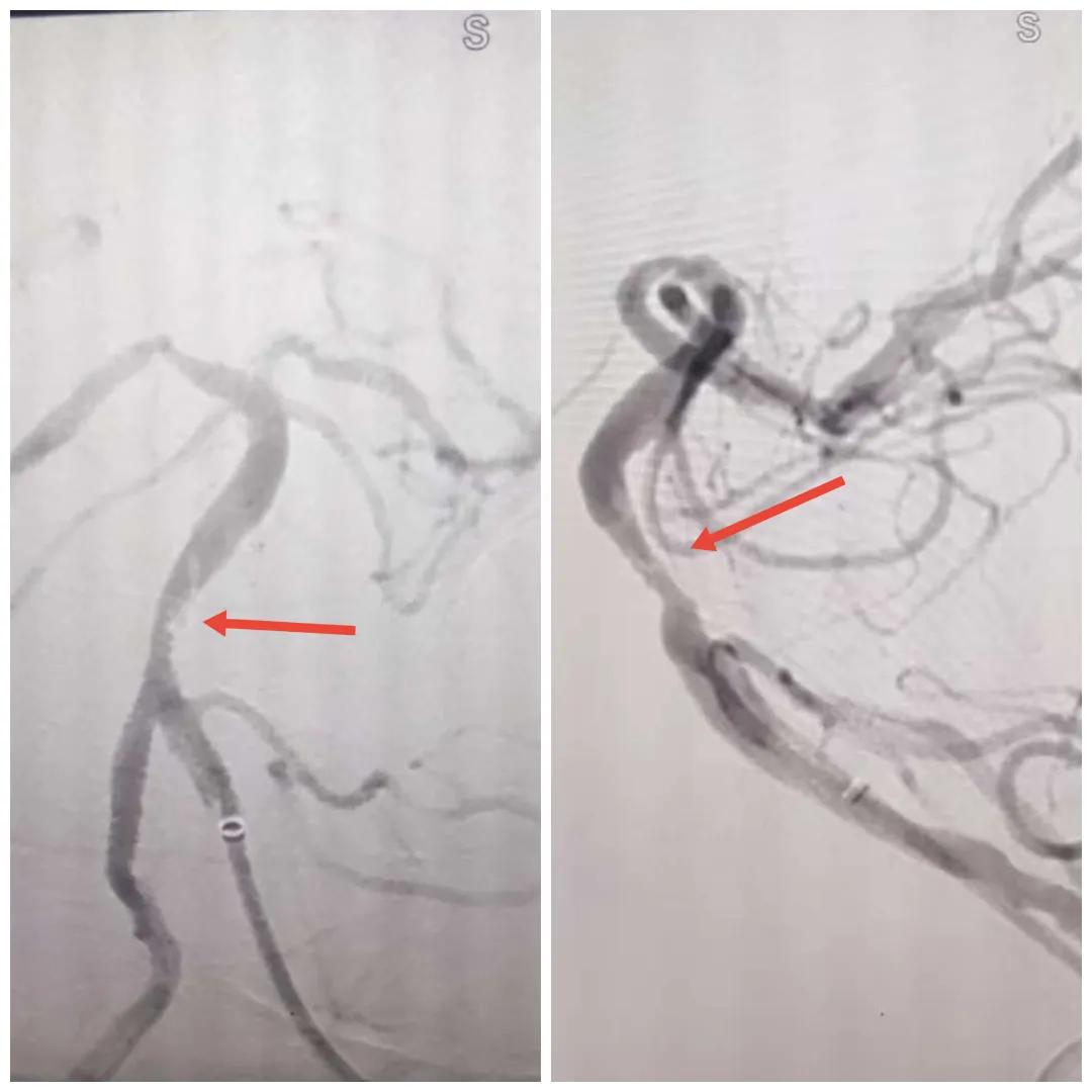 在經(jīng)造影后,主刀醫(yī)生腦一科副主任楊慶堂發(fā)現(xiàn)患者基底動(dòng)脈下段重度狹窄且狹窄段以遠(yuǎn)有大負(fù)荷血栓,其狹窄處考慮為動(dòng)脈夾層,手術(shù)難度及風(fēng)險(xiǎn)較大。楊慶堂副主任在彭壯副主任醫(yī)師的協(xié)助下運(yùn)用spaceman(太空人)技術(shù),中間導(dǎo)管抵近血栓抽吸配合支架拉栓,成功開(kāi)通血管。再次造影可見(jiàn)基底動(dòng)脈管腔明顯增寬,遠(yuǎn)端血管顯影良好,且等待20分鐘后造影仍顯示血流通暢。楊慶堂副主任考慮到本次手術(shù)時(shí)間不宜過(guò)長(zhǎng),現(xiàn)患者基底動(dòng)脈及分支前向血流維持良好,給予其抗栓藥物應(yīng)用后結(jié)束手術(shù),并建議患者3個(gè)月后復(fù)查造影,明確其基底動(dòng)脈夾層情況。