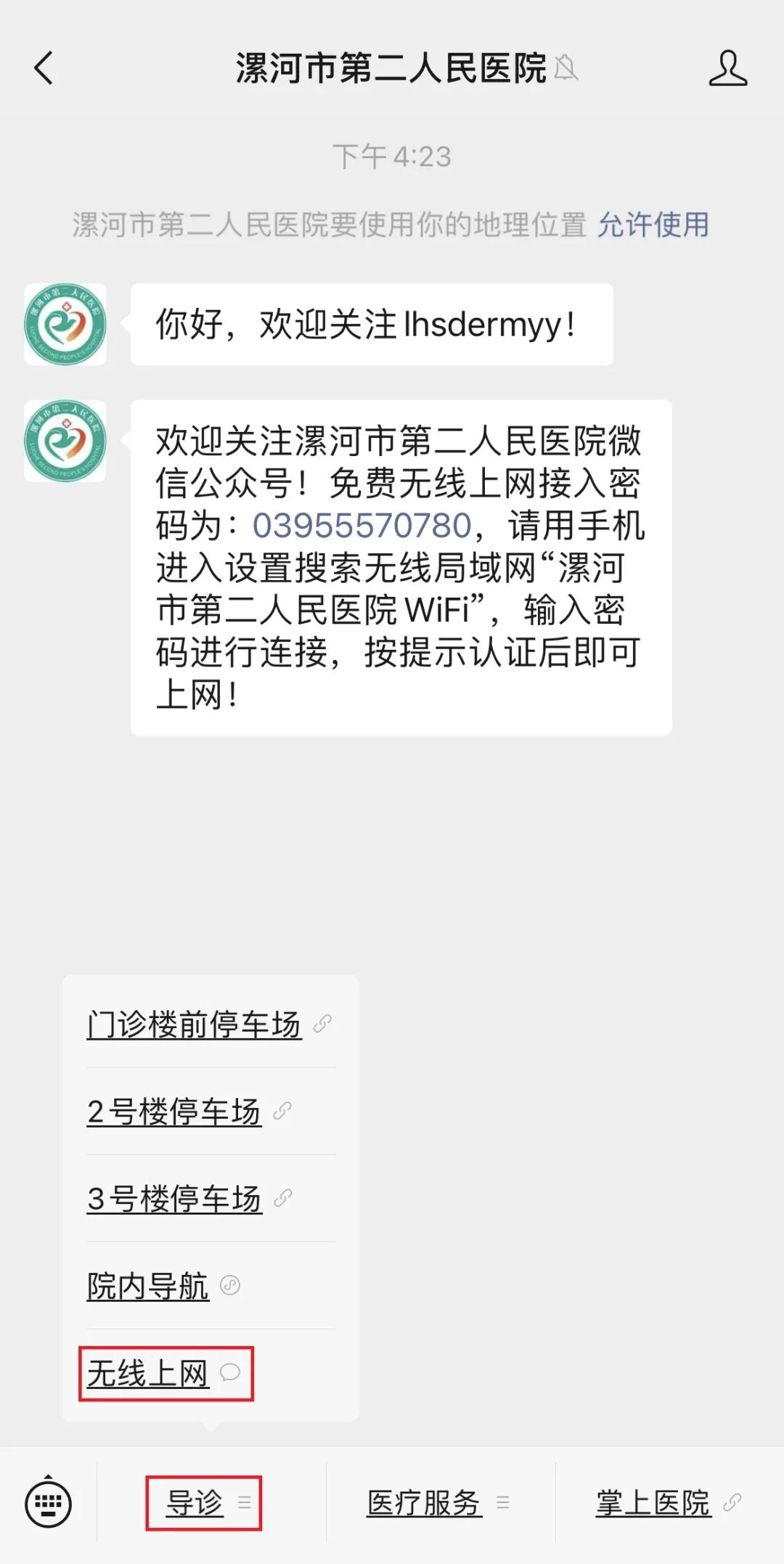 2. 關注市二院公眾號后,點導診--無線上網(wǎng)獲取上網(wǎng)密碼。