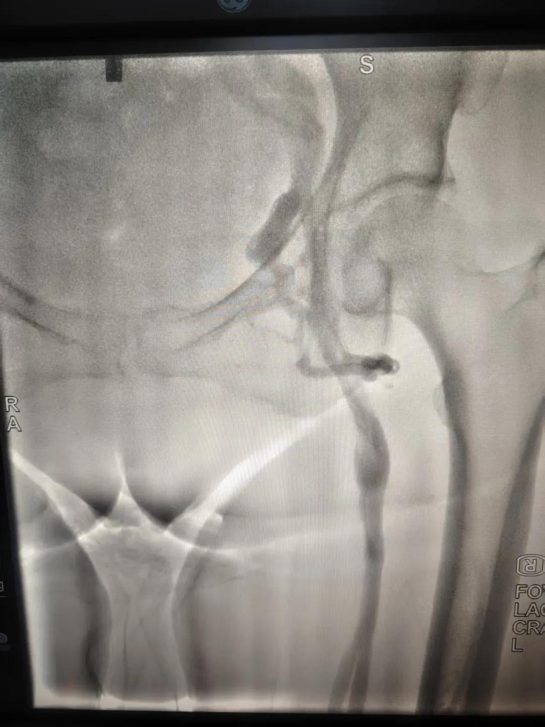 該患者,中年女性,左下肢反復(fù)腫脹、疼痛多年就醫(yī),未明病因。門診就診,經(jīng)血管外科副主任周創(chuàng)業(yè)評估病情后,為該患者門診行下肢靜脈造影,造影結(jié)果示:左髂靜脈周圍側(cè)枝形成,左髂靜脈壓迫綜合癥。明確診斷后將擇期介入手術(shù)治療。