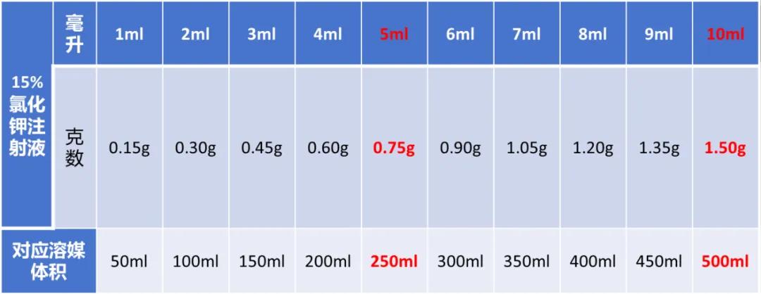計算公式:所需氯化鉀注射液最大允許體積(ml)=溶媒總量(ml)×0.3% ÷氯化鉀濃度(15%)