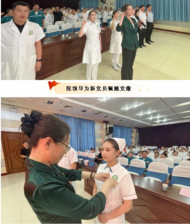 百年篳路藍縷,百年風雨兼程?;顒右潦?,由醫(yī)院黨委班子為新黨員佩戴黨徽,以“一枚黨徽”凝聚紅色力量,以“雙重身份”踐行醫(yī)者初心;全體黨員在院黨委書記、院長楊軼的領誓下重溫入黨誓詞,鏗鏘誓言重溫入黨初心,醫(yī)心向黨堅定奮進信念。