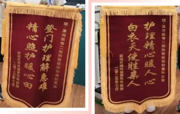 “真是太感謝孟冰和王露護士了,這兩面錦旗你們一定要收下!”7月16日,一名老年患者家屬將兩面錦旗送到了漯河醫(yī)專二附院(漯河市骨科醫(yī)院、漯河市立醫(yī)院)智能微創(chuàng)骨科護士站,再三感謝兩位護士上門為老人維護、更換導尿管。