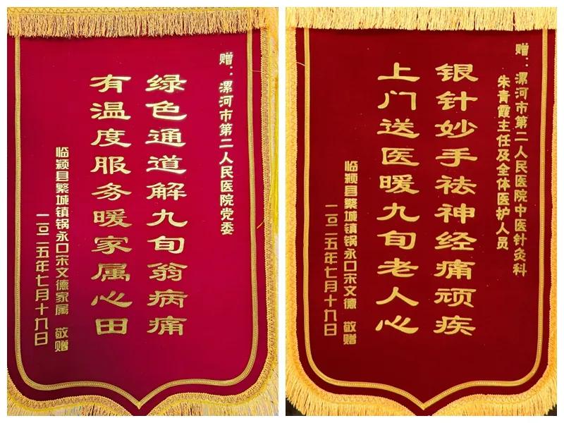 據(jù)了解,10天前,市二院急診科接到一位家住臨潁90多歲高齡患者家屬的求助電話:老人因帶狀皰疹疼痛、瘙癢引起眩暈,行動(dòng)不便,無(wú)法前往醫(yī)院就診。院黨委了解情況后高度重視,當(dāng)即安排中醫(yī)針灸科主任朱青霞帶領(lǐng)護(hù)士長(zhǎng)安虹、副主任康復(fù)師陳莉驅(qū)車(chē)前往臨穎,為高齡患者進(jìn)行上門(mén)診治。經(jīng)檢查,確診患者為帶狀皰疹性神經(jīng)痛,隨即采取祛瘀排毒生新配合中藥涂擦等綜合療法進(jìn)行治療。治療后,患者疼痛明顯緩解,當(dāng)晚即能安然入睡。次日,家屬陪同老人來(lái)到市二院中醫(yī)針灸科住院治療,經(jīng)過(guò)一周的精心診治,老人病情明顯好轉(zhuǎn),基本康復(fù)痊愈出院,患者及家屬對(duì)治療效果非常滿意。這次特來(lái)醫(yī)院向院黨委、朱青霞主任及科室全體醫(yī)護(hù)人員敬贈(zèng)錦旗致謝。
