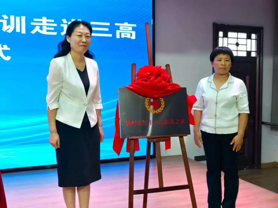 現(xiàn)場,郭俊偉向“漯河市第三高級中學紅十字應急救護社團”代表授旗,孫潁華和胡海英共同為“紅十字志愿者之家”揭牌。