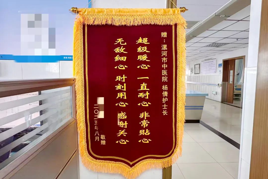 近日,科室里上演了一幕動人場景:患者及家屬將一面寫著 “超級暖心 一直耐心 非常貼心,無敵細心 時刻用心 感謝關(guān)心” 的錦旗送到楊倩護士長手中。字字句句都凝結(jié)著對護理團隊的真摯謝意,也體現(xiàn)了雙向奔赴的醫(yī)患深情。