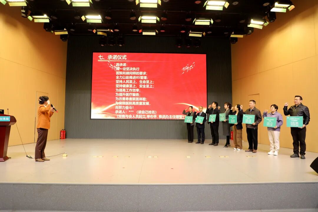 在隨后進行的承諾儀式環(huán)節(jié),護理部主任高凱霞帶領(lǐng)全體與會人員莊嚴(yán)宣誓。鏗鏘有力的誓言,傳遞出全院職工全力以赴推進8S管理、提升醫(yī)療品質(zhì)的堅定決心。
