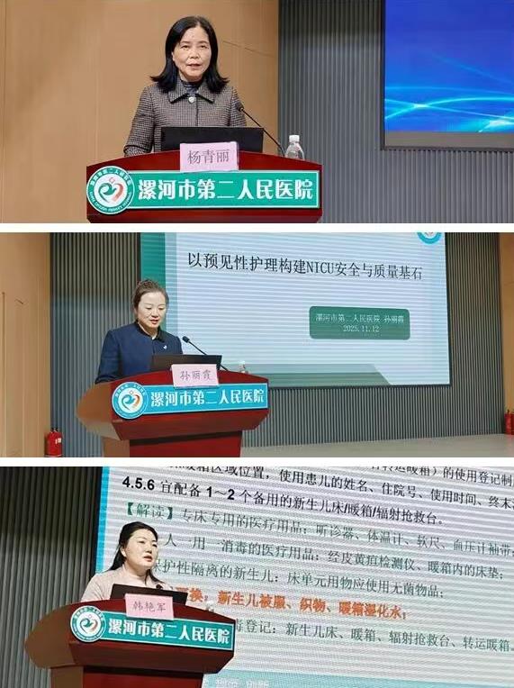 學(xué)術(shù)交流環(huán)節(jié),市中心醫(yī)院NICU護(hù)士長楊青麗以《新生兒低血糖臨床規(guī)范管理專家共識(shí)》(2021)為題,系統(tǒng)闡述了新生兒低血糖的“預(yù)防、篩查、干預(yù)、隨訪”四個(gè)重點(diǎn);市二院護(hù)理部副主任孫麗霞分享了《以預(yù)見性護(hù)理構(gòu)建NICU安全與質(zhì)量基石》,點(diǎn)明預(yù)見性護(hù)理是NICU生命安全保障的基石,也是質(zhì)量持續(xù)提升的第一道防線;市二院感控辦副主任韓艷軍以《新生兒病區(qū)醫(yī)院感染預(yù)防與控制標(biāo)準(zhǔn)》進(jìn)行了交流,闡明要嚴(yán)守感控標(biāo)準(zhǔn),筑牢安全防線,保障每一位新生兒的健康與安全;市婦幼保健院兒科護(hù)士長鄭文韜以《高危兒靜脈通路的合理選擇》展開,講解了高危兒靜脈通路的選擇,核心在于基于個(gè)體評(píng)估,實(shí)現(xiàn)安全與療效的最佳平衡;市二院靜療專科護(hù)士李艷結(jié)合《兒童靜療常見并發(fā)癥的預(yù)防及處理》,提出兒童靜療安全,核心在于以預(yù)防為首;市二院傷口造口專科護(hù)士馬美華分享了《兒童常見皮膚護(hù)理與管理》,闡述嚴(yán)守預(yù)防底線,踐行精細(xì)照護(hù),是守護(hù)新生兒稚嫩肌膚、避免醫(yī)源性皮膚損傷的根本之道。