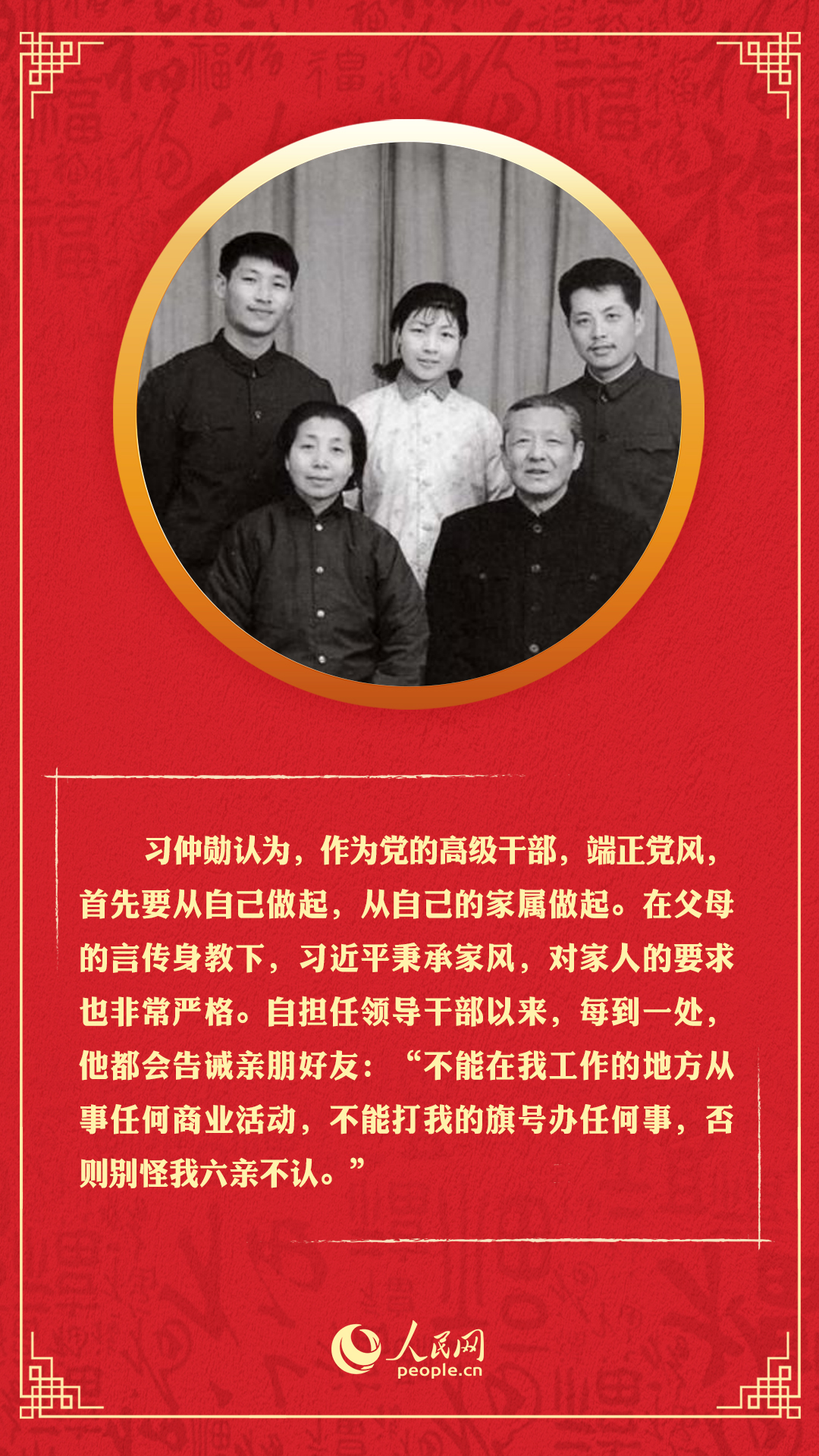 “千家萬戶都好,國家才能好,民族才能好。”在中國傳統(tǒng)文化中,“家國天下”的情懷浸入每一個中國人的骨髓血脈。家庭是社會的基本細胞,是人生的第一所學校。正是這個課堂,塑造了習近平的家國情懷,也成為他修身齊家治國理政的信念源泉。新春佳節(jié),一起回顧習近平的家風故事,學習以家風涵養(yǎng)初心使命。