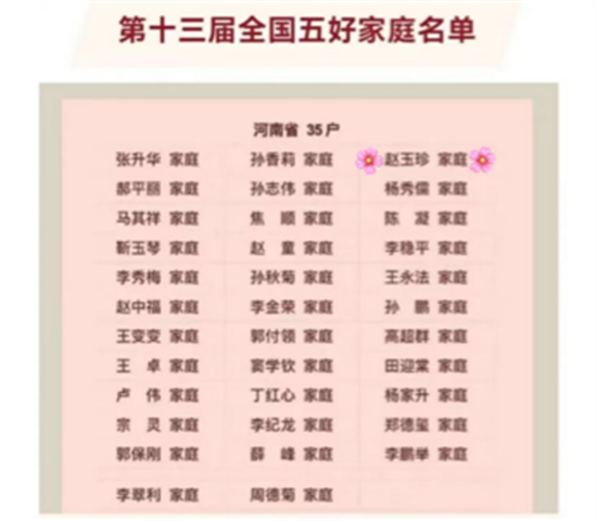 5月15日,全國婦聯(lián)表彰997戶全國五好家庭,鄭州市3戶家庭上榜,高新區(qū)石佛辦事處趙玉珍家庭獲得第十三屆“全國五好家庭”榮譽稱號。