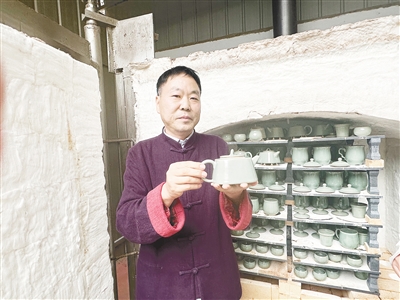 “天青色,瑪瑙釉??粗。?。芝麻釘,釉裹足。體輕巧,內(nèi)含秀。香灰胎,蟬翼紋。晨星稀,潤如玉。很養(yǎng)眼,不刺目……”11月4日上午,在郾城區(qū)新店鎮(zhèn)雙樓徐村,記者見到了國家級(jí)非物質(zhì)文化遺產(chǎn)項(xiàng)目汝瓷燒制技藝代表性傳承人王君子的徒弟徐大磊。一見到記者,徐大磊就用這段朗朗上口的順口溜,表達(dá)了他對(duì)天青釉汝瓷的喜愛之情。