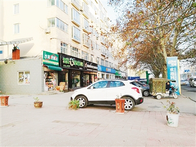 在擺放的花盆另一側(cè),有用白線劃定的幾個(gè)停車位,而在車位頂端的一條線上,也擺了一排花盆,用來防止車輛???。記者注意到,有了花盆阻擋,幾輛汽車和電動(dòng)車只能??炕ㄅ枞Χǚ秶酝獾穆访嫔?。