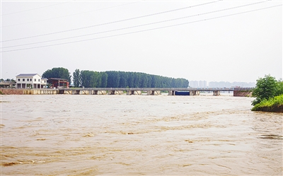 7月23日上午,記者在沙河、澧河交匯處看到,河水流速加快,水位明顯升高,河面顯得寬了不少,渾濁的河水中飄浮著大量水草。沙河節(jié)制閘處閘孔全開,正在全力泄洪,節(jié)制閘兩側南北河道的水位也已經(jīng)持平(如圖)。