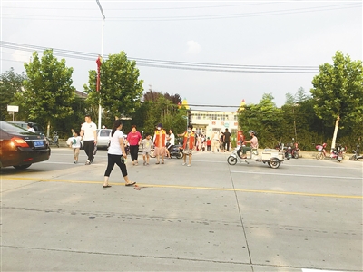 當(dāng)天下午,記者來(lái)到位于太行山路北段東側(cè)的孟廟鎮(zhèn)中心幼兒園門(mén)口。正值幼兒園放學(xué)時(shí)間,接送孩子的家長(zhǎng)較多,部分家長(zhǎng)把車(chē)輛停在了學(xué)校對(duì)面,接到孩子后需要穿過(guò)馬路回家。因?yàn)槁飞蠜](méi)有設(shè)置安全警示牌,也沒(méi)有減速帶、斑馬線等交通標(biāo)識(shí),家長(zhǎng)帶著孩子在車(chē)流中穿梭(如圖)。