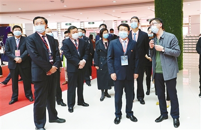 11月1日,市四大班子領(lǐng)導(dǎo)帶領(lǐng)市直相關(guān)部門負(fù)責(zé)同志察看第十八屆中國(漯河)食品博覽會(huì)展館。本報(bào)記者 王慶建 攝