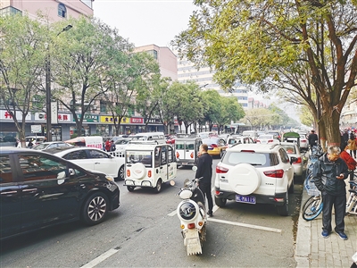 下午3時40分,記者在前往漯河育才學(xué)校的路上發(fā)現(xiàn)泰山路從遼河路口起往北出現(xiàn)大擁堵,機(jī)動車道兩側(cè)停滿了接學(xué)生放學(xué)的車輛,各種三輪車和自行車則占據(jù)了非機(jī)動車道。尤其是學(xué)校門前的機(jī)動車道兩側(cè)都只剩下一個車道通行,加上多路公交車通過,整條道路擁堵不堪。在學(xué)校大門前,記者未發(fā)現(xiàn)交警在現(xiàn)場指揮,未見管理道路交通的志愿者,只見多名身著志愿者服裝的家長志愿者和教師志愿者在維持學(xué)生隊(duì)伍秩序。