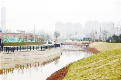 目前,全長1.1公里的幸福渠交通北路工程建設(shè)已經(jīng)大頭落地,成效顯著。工程共開挖明渠900米,建設(shè)公廁一座、觀景平臺3處、沉井6座、過路頂管200米,渠道平均寬約8米至10米,水深1.5米至1.7米,綠化面積3.7萬平方米,11月26日已經(jīng)正式通水。在現(xiàn)場采訪時,記者看到渠水蕩漾,白橋橫臥,三三兩兩的市民沿著渠岸一邊散步,一邊觀賞風(fēng)景。昔日荒草地,如今景色如畫。
